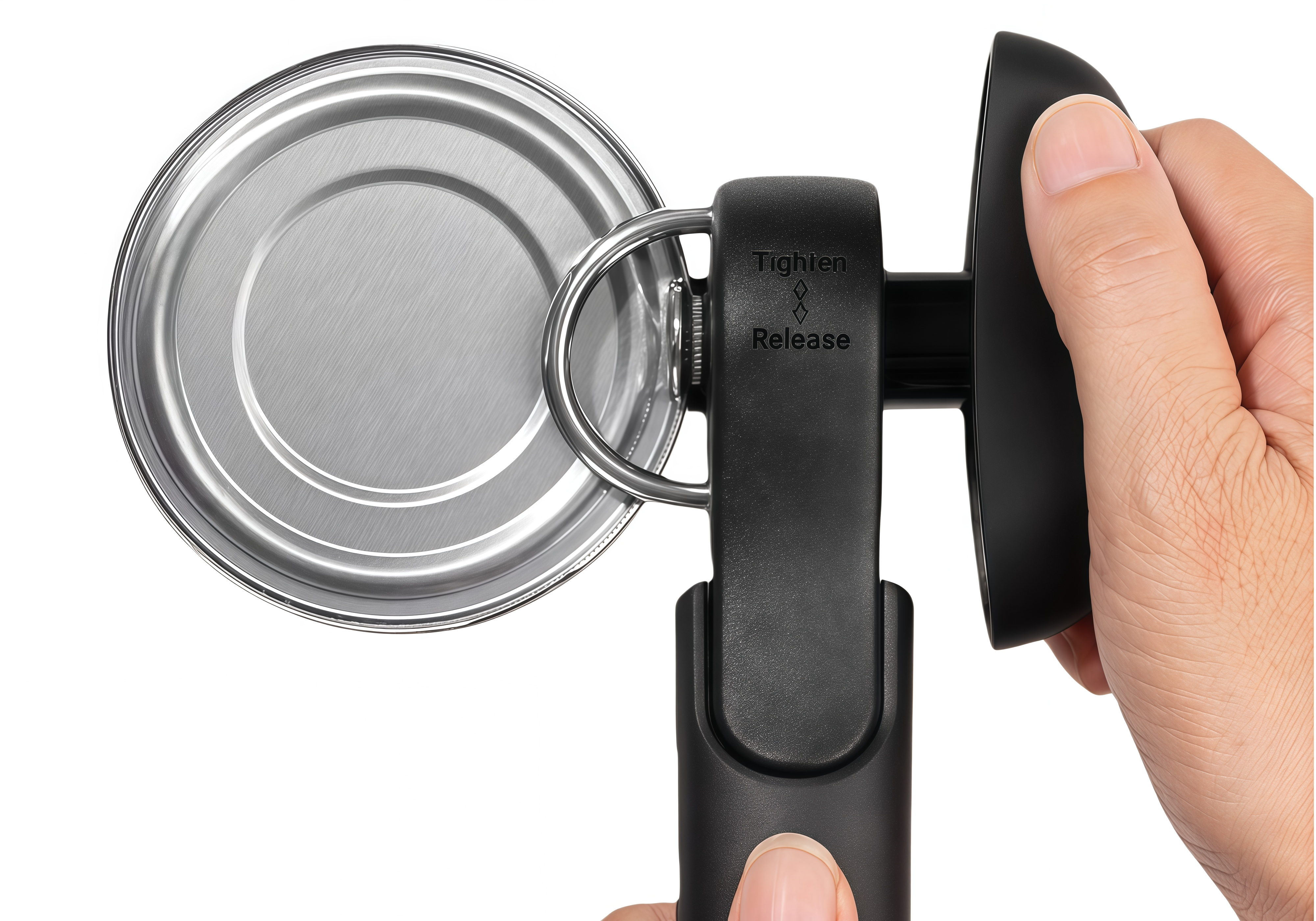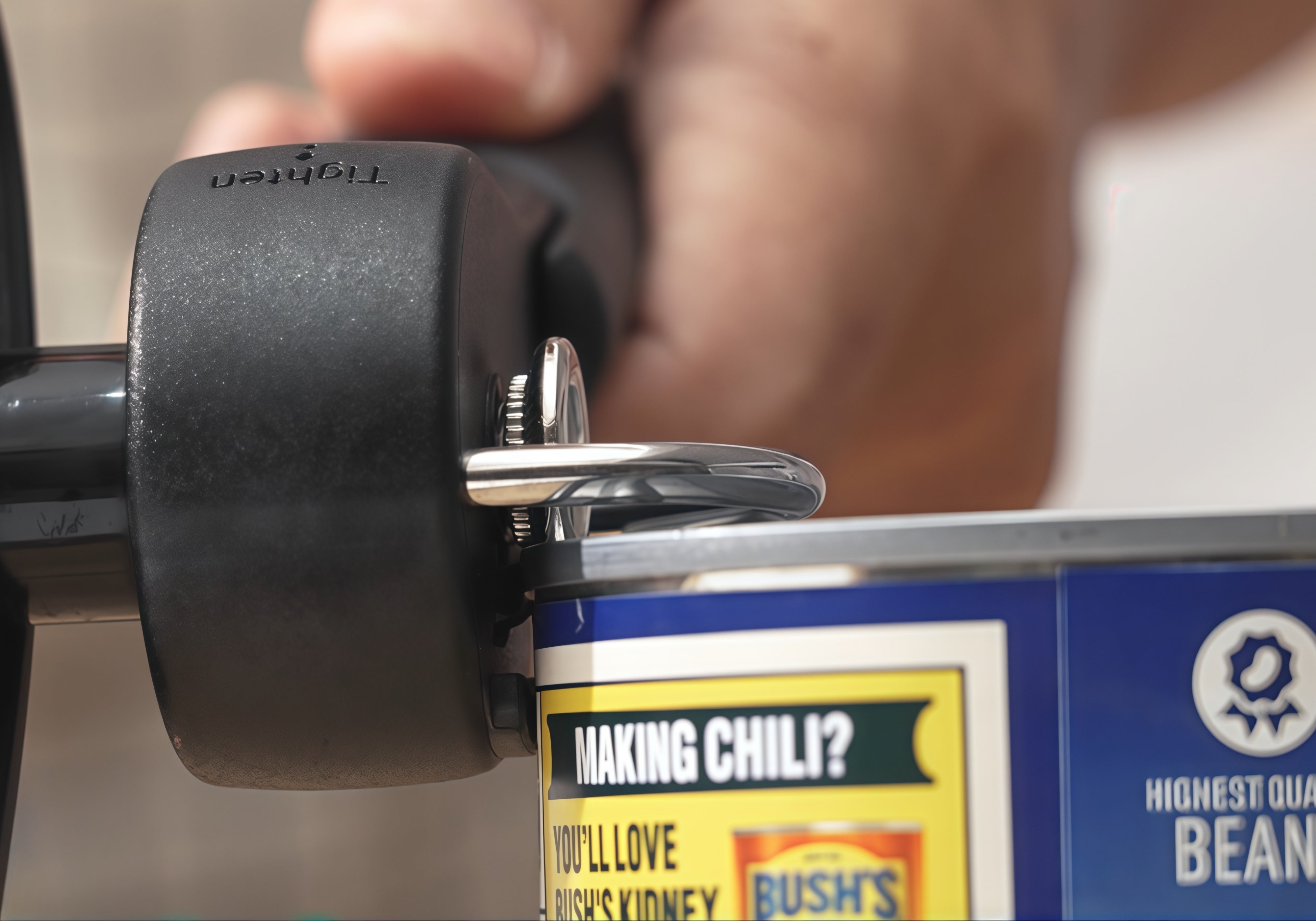 The unique Tighten & Release icon design guides the correct direction to turn the knob when opening cans