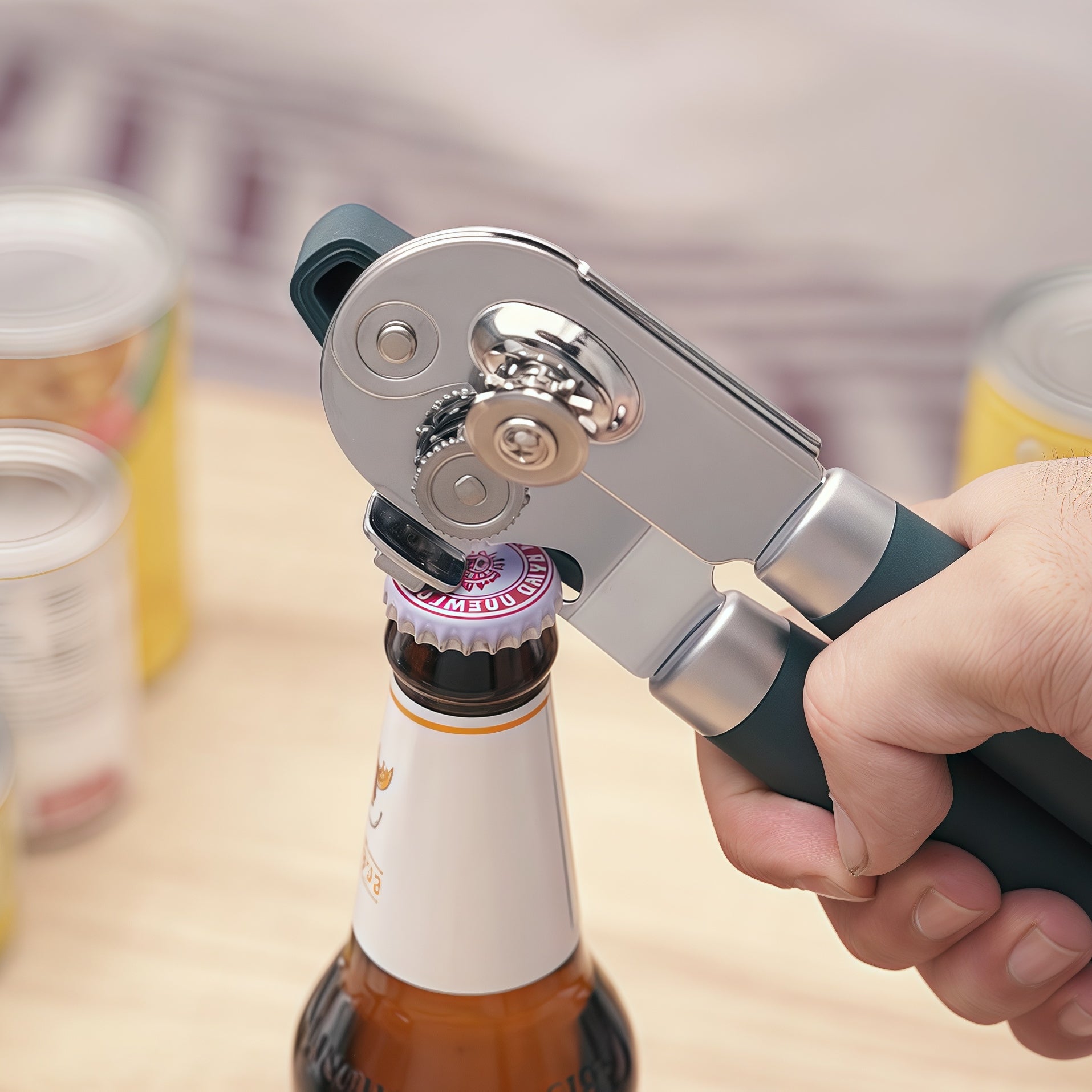 Multifunctional can opener with built-in bottle opener for easy opening of bottles and cans.