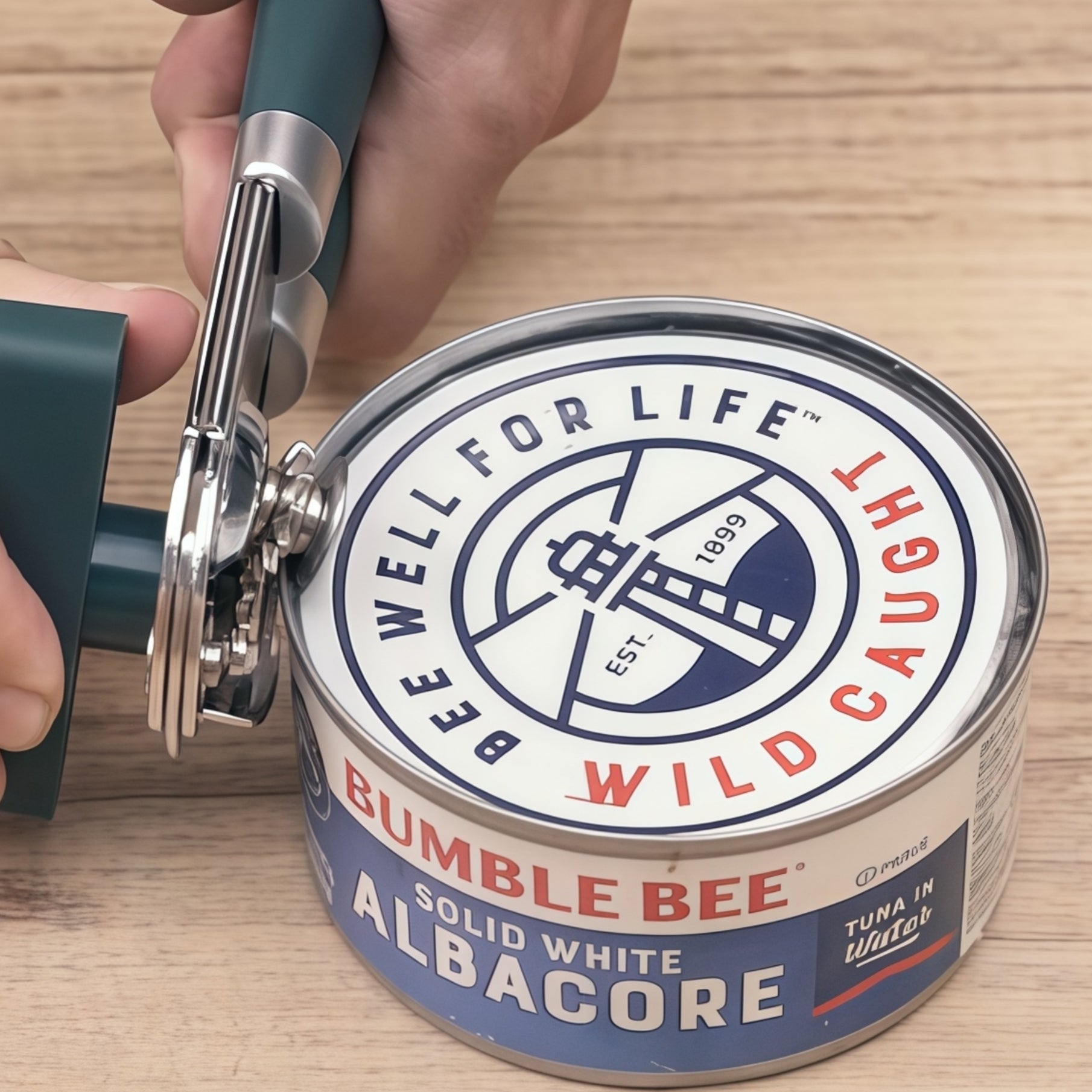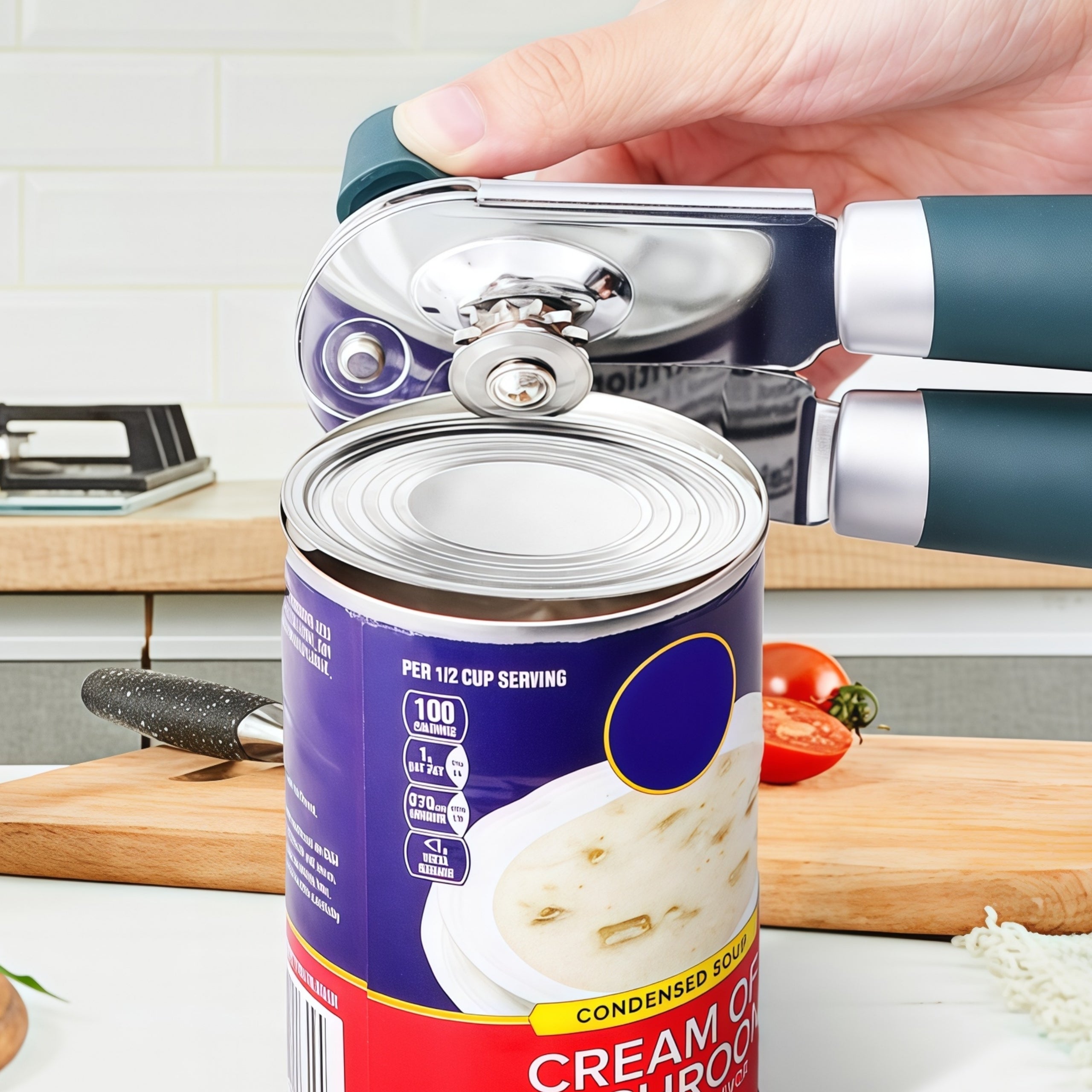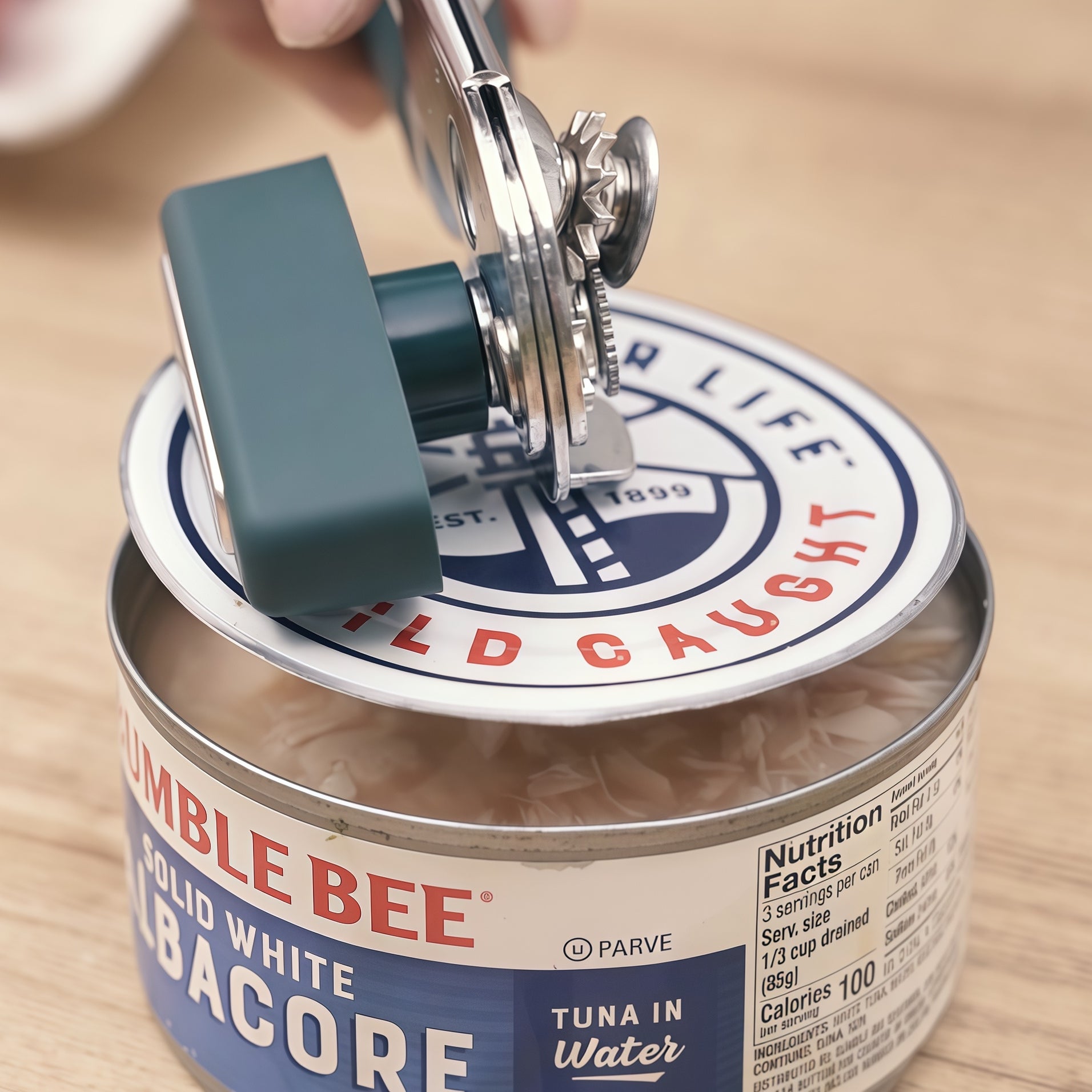 Upgraded can opener with razor-sharp steel blade and precision gears for smooth cuts—no jagged edges.