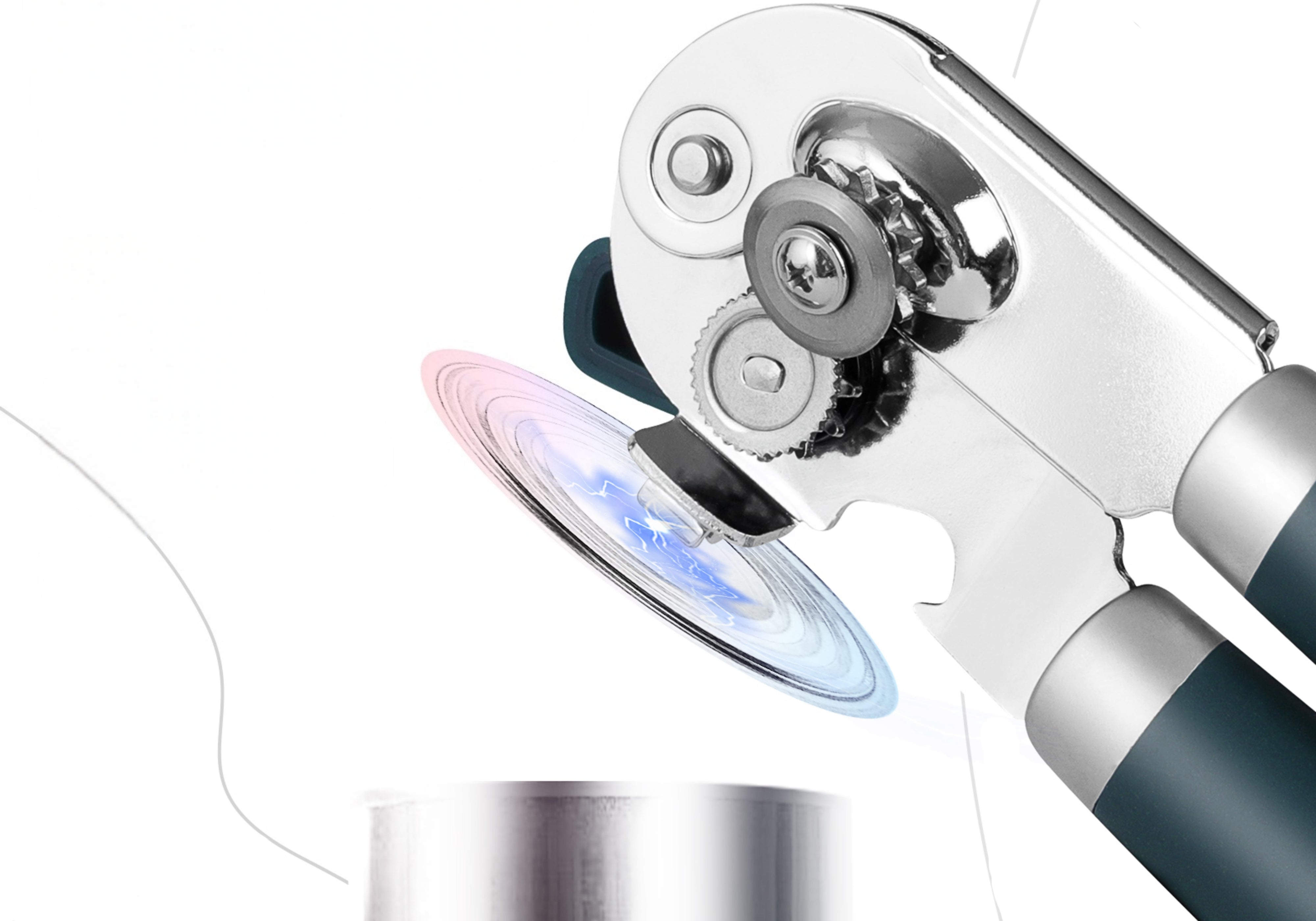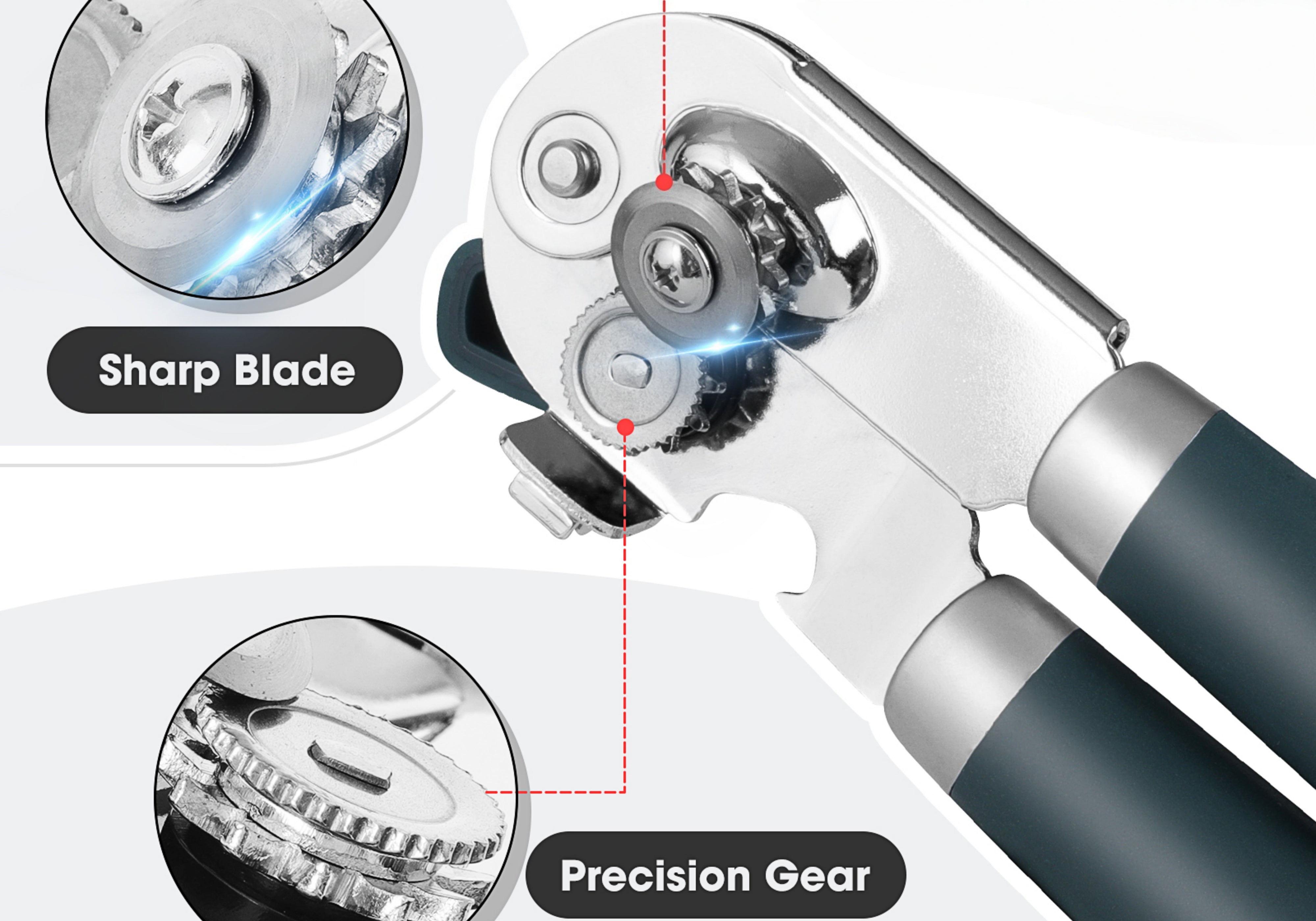 1.Smooth Edge Can Opener - The most basic principle of the manual can opener is to use a gear to drive a sharp blade to make a circle to open the can lid. So we improved the precision of the gear and used high carbon steel blades instead of ordinary blades, the razor-sharp blade and precision gears work perfectly together to cut the lid smoothly with every revolution of the blade. so don't worry about getting scratched by the burred edge of the can when scooping food from the can.