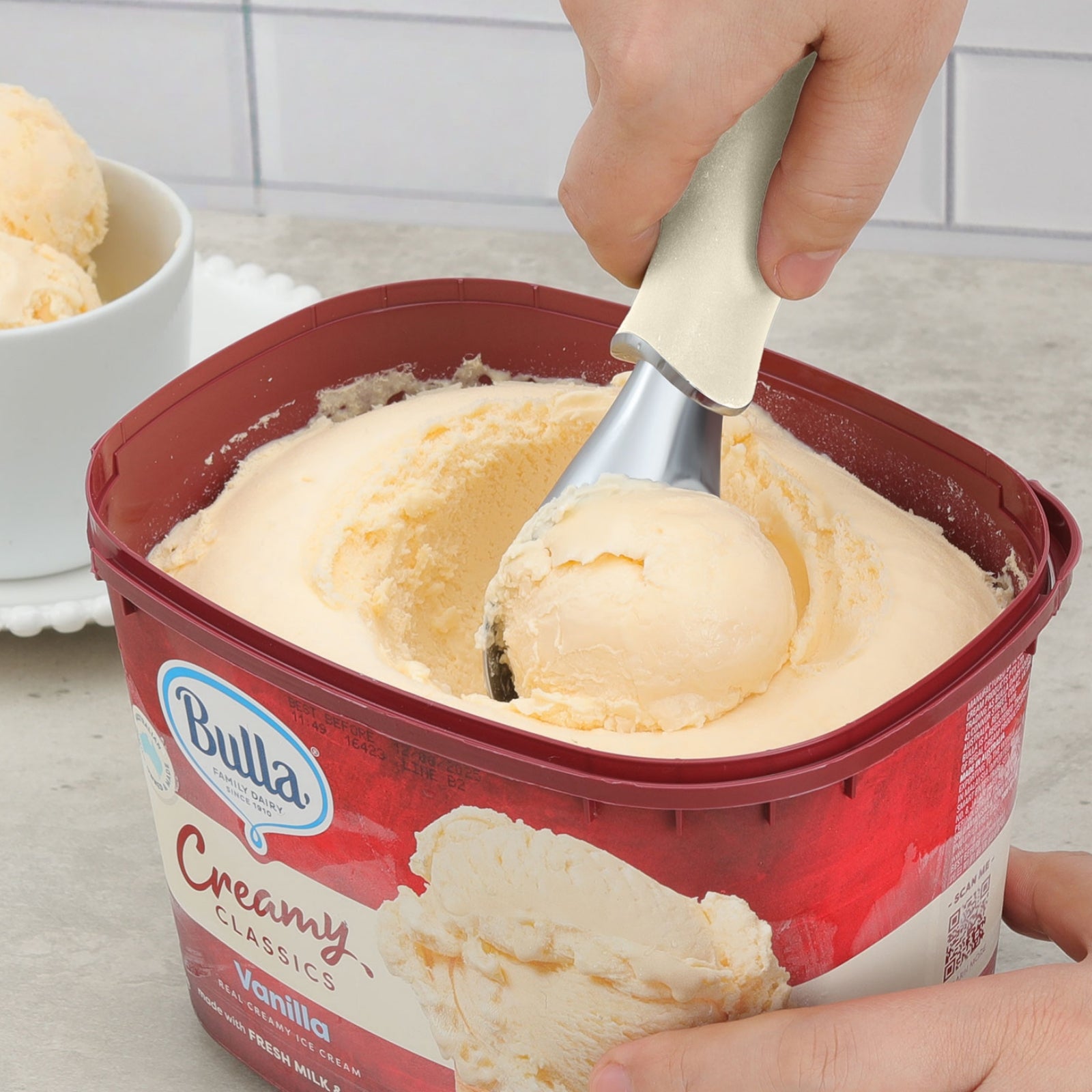 The polished front edge cuts through frozen ice cream easily, while the curved scoop forms smooth, round balls effortlessly.