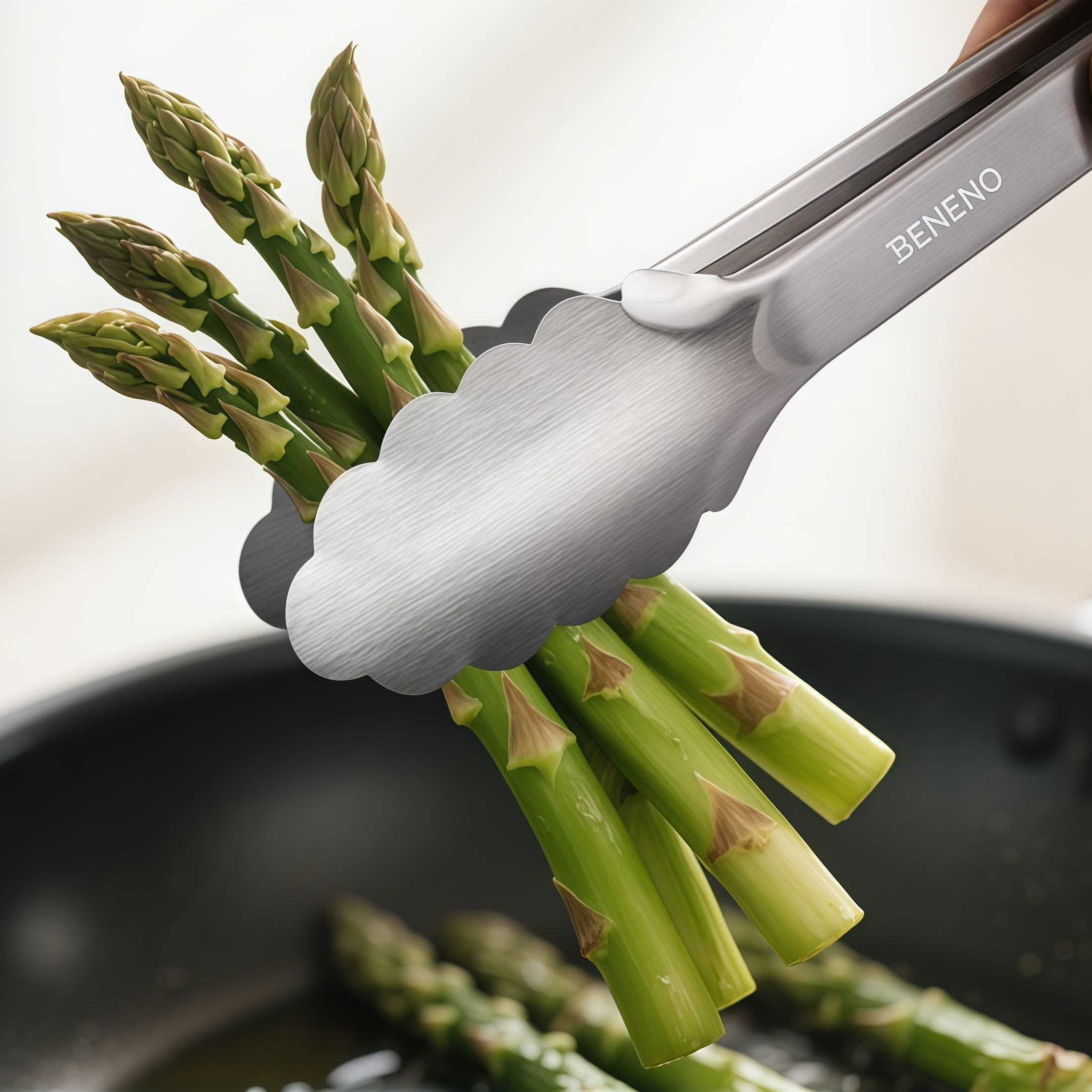 1、Food-Grade Stainless Steel 12-Inch Tongs: Built to last with professional performance, crafted from food-grade high-quality stainless steel, Beneno 12-inch kitchen tongs provides safe distance and better leverage withstands extreme heat up to 600°F while resisting rust, warping and wear during long time use, perfect for every kitchen cooking or outdoor scenario, versatile for cooking, tossing and transferring food, which is a reliable select for use as kitchen cooking tongs or grill BBQ tongs