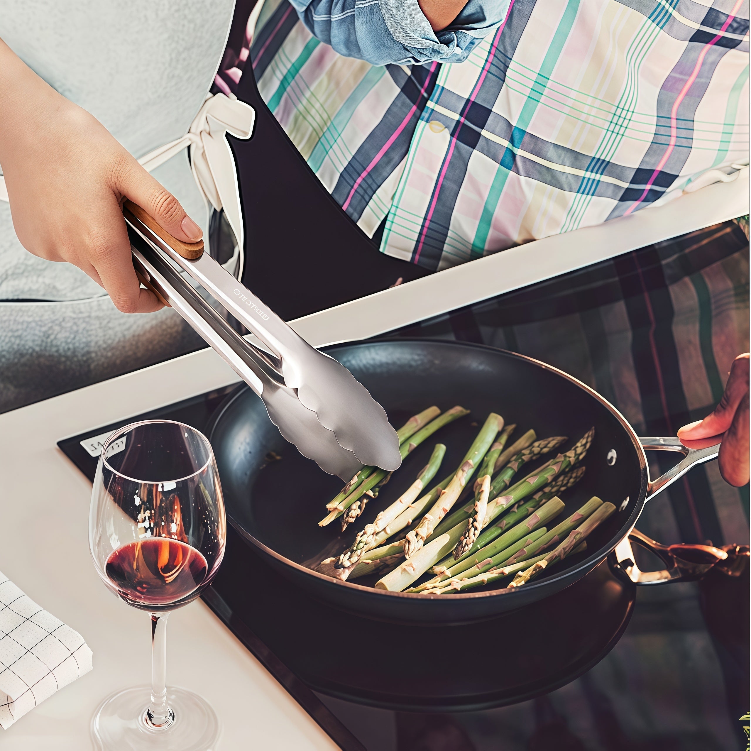 3、Ergonomic Heat-Insulating Wooden Grip: These cooking tongs feature ergonomic beechwood handles with integrated thumb rests for a secure and comfortable grip, also the wooden handle provides better heat insulation than metal and superior durability compared to silicone, making it a ideal cooking tongs for your kitchen