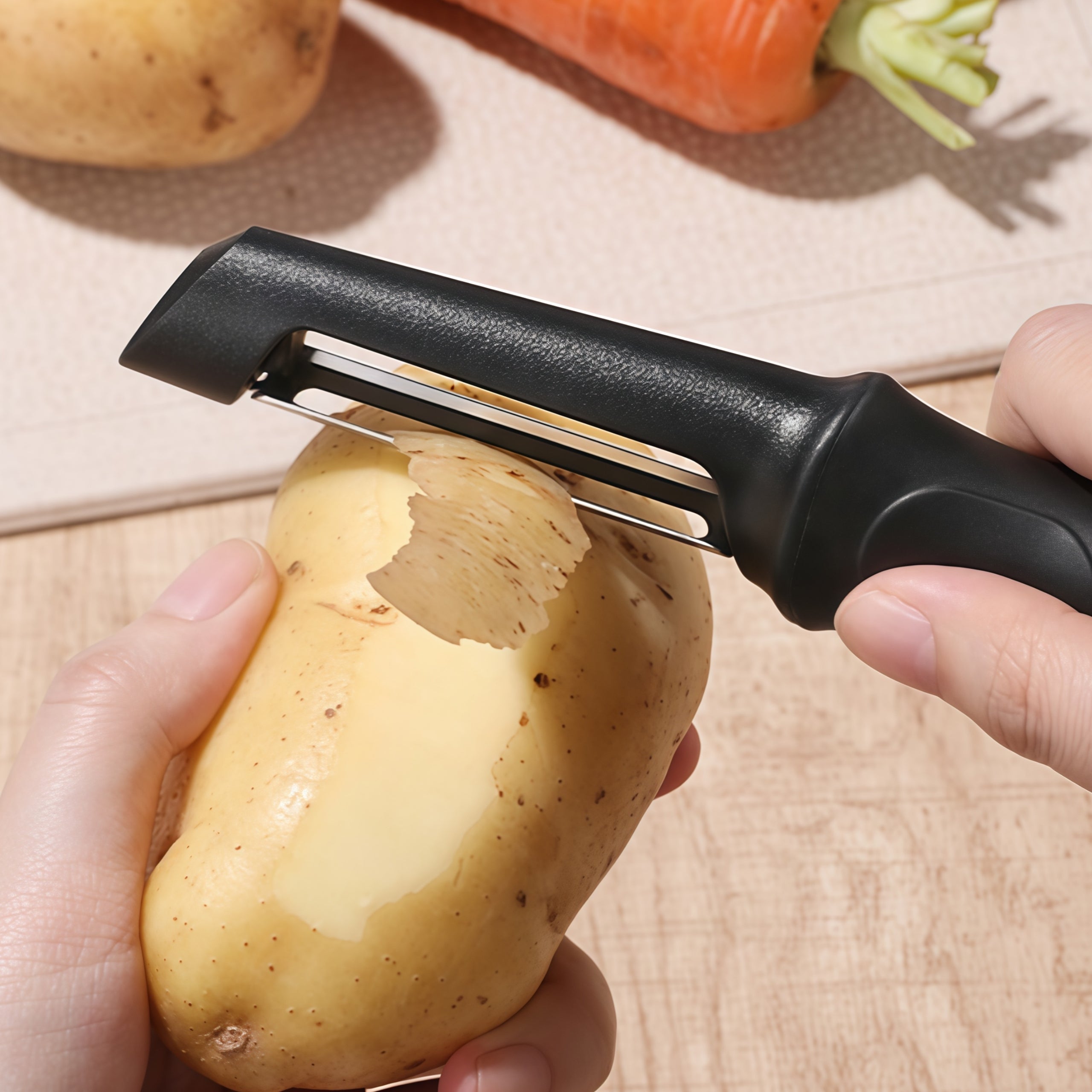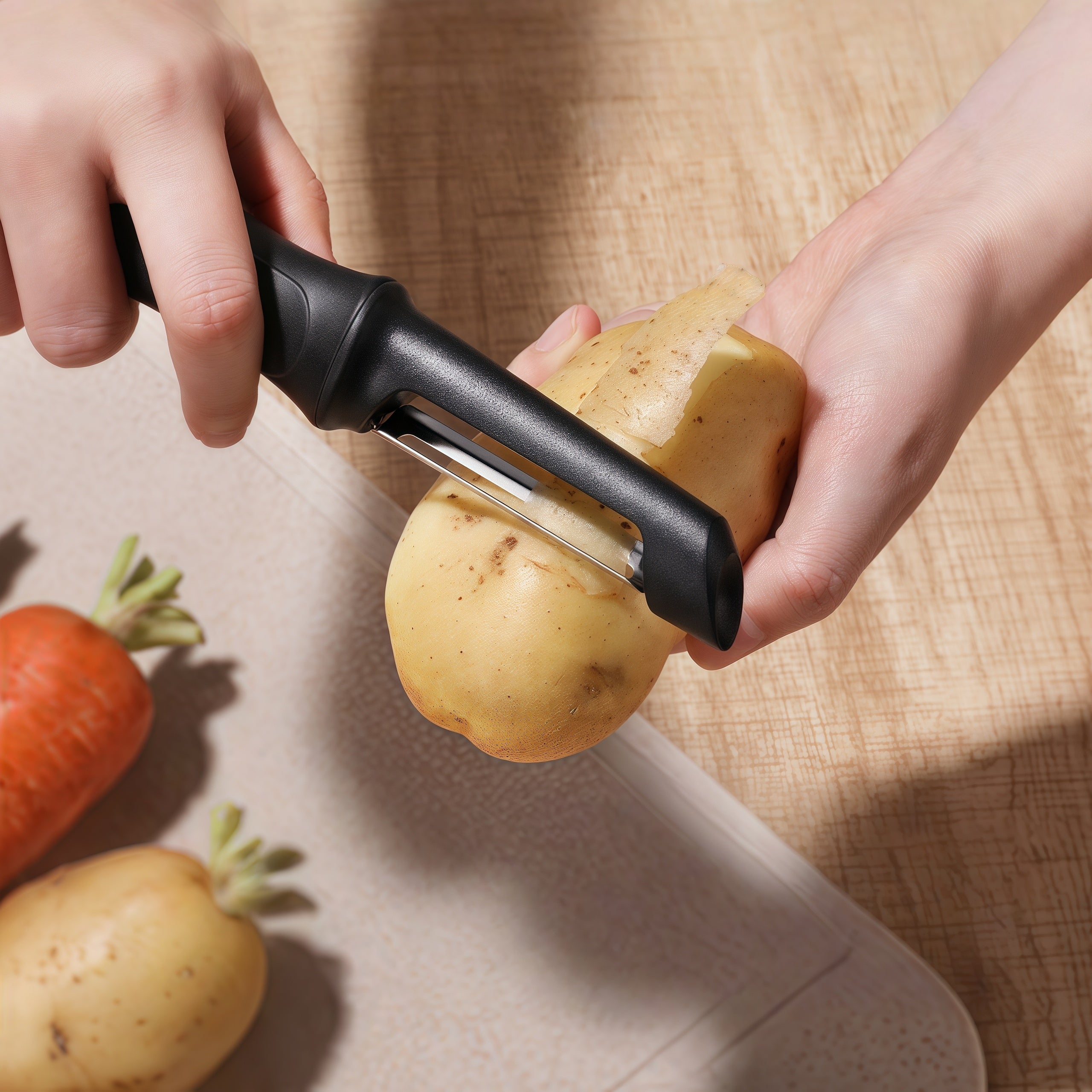 Peels smoothly in both directions, adapting to produce shapes, making it easy to peel curved vegetables like potatoes and apples.