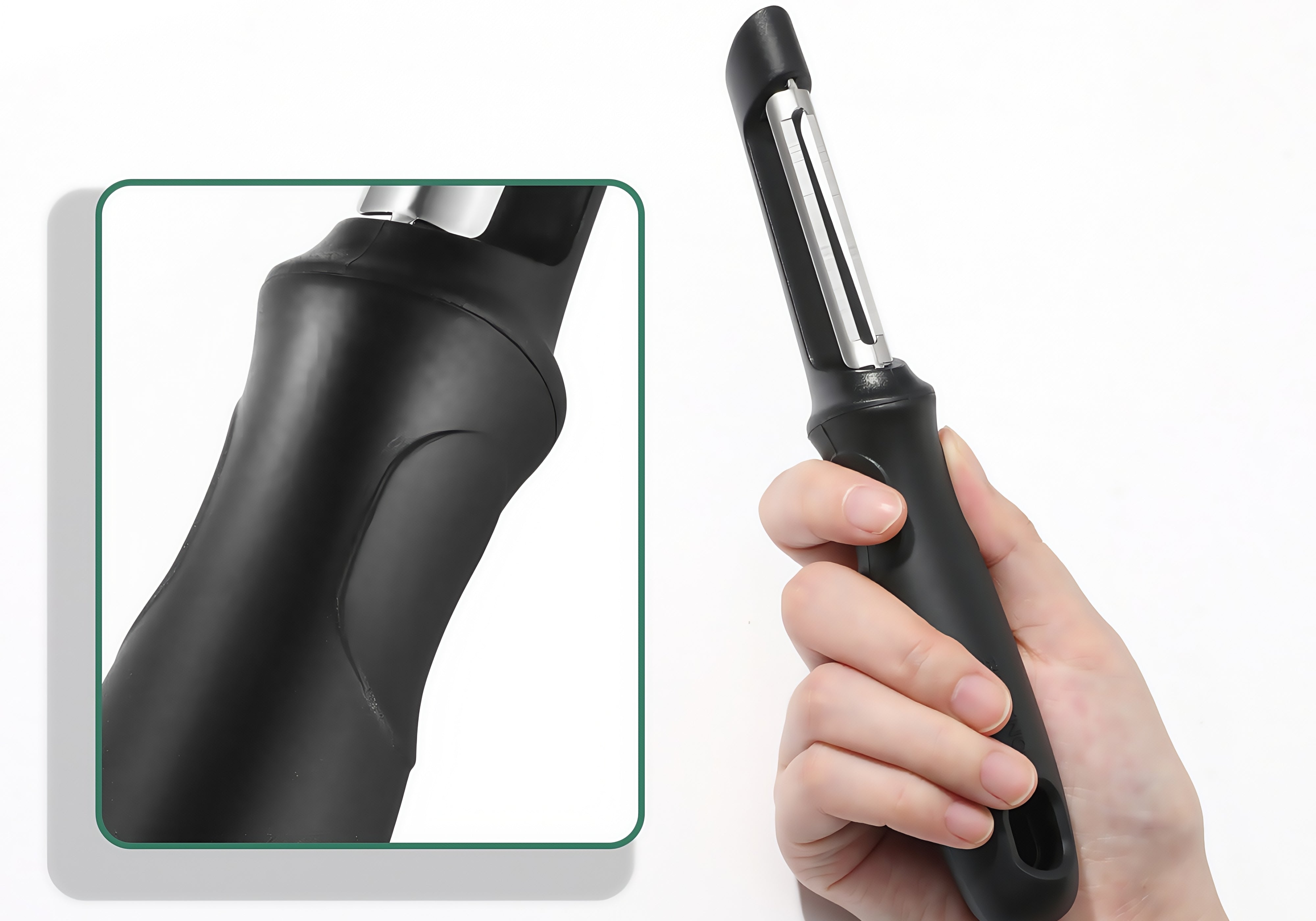 Lightweight rubber handle with ergonomic thumb pad for a comfortable, non-slip grip, ensuring control even with wet hands during long peeling.